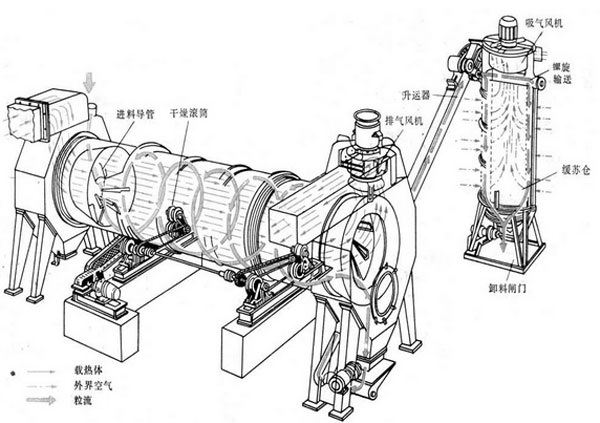 鋸末烘干機設備主要包括的設備有生熱爐、進料口、旋轉筒、過濾筒、物料輸送管、冷卻筒和出料口等組成。